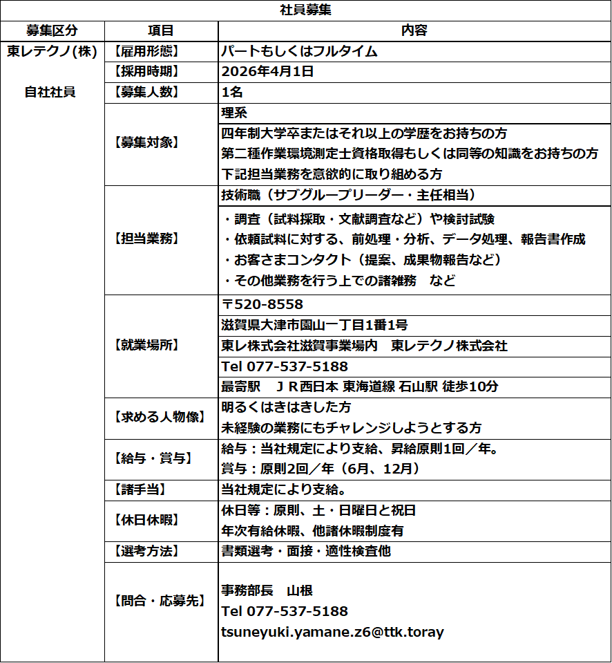 【社員募集中】理系技術職(サブグループリーダー・主任相当)<br>明るくはきはきした方、未経験の業務にも果敢にチャレンジしようとする方 大歓迎 | 東レテクノ株式会社