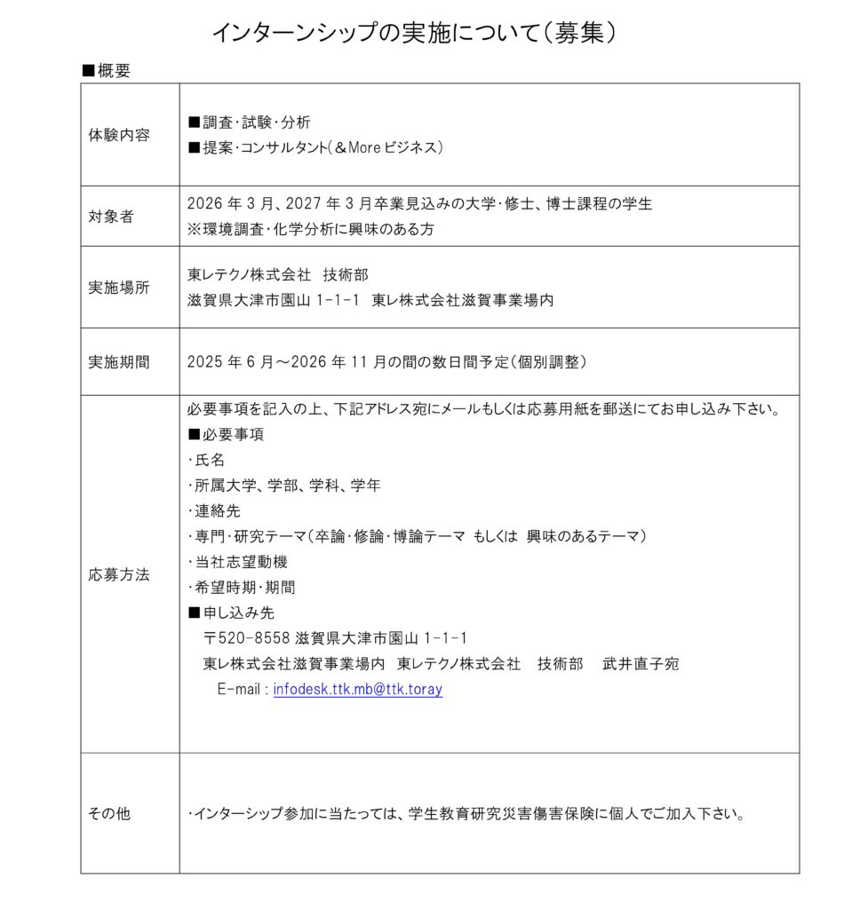 【インターンシップ募集中】<br>2026年3月・2027年3月卒業見込みの大学・修士、博士課程の学生<br>※環境調査・化学分析に興味のある方 歓迎 | 東レテクノ株式会社