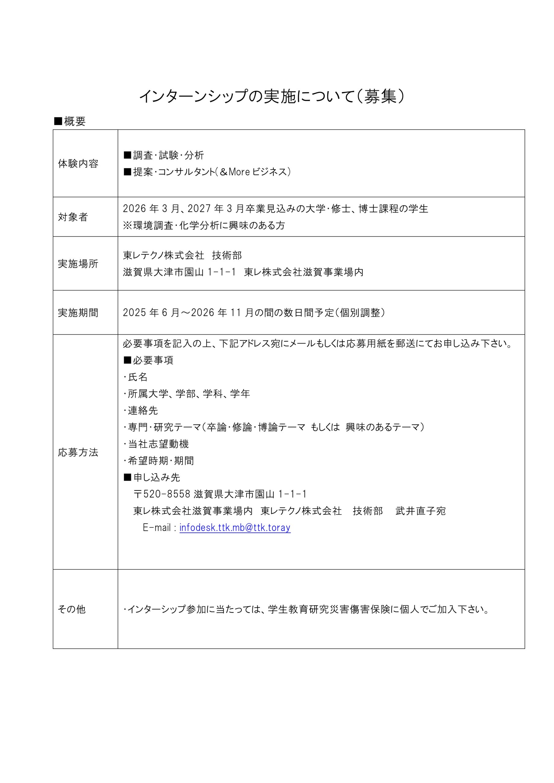 【インターンシップ募集中】<br>2026年3月・2027年3月卒業見込みの大学・修士、博士課程の学生<br>※環境調査・化学分析に興味のある方 歓迎 | 東レテクノ株式会社