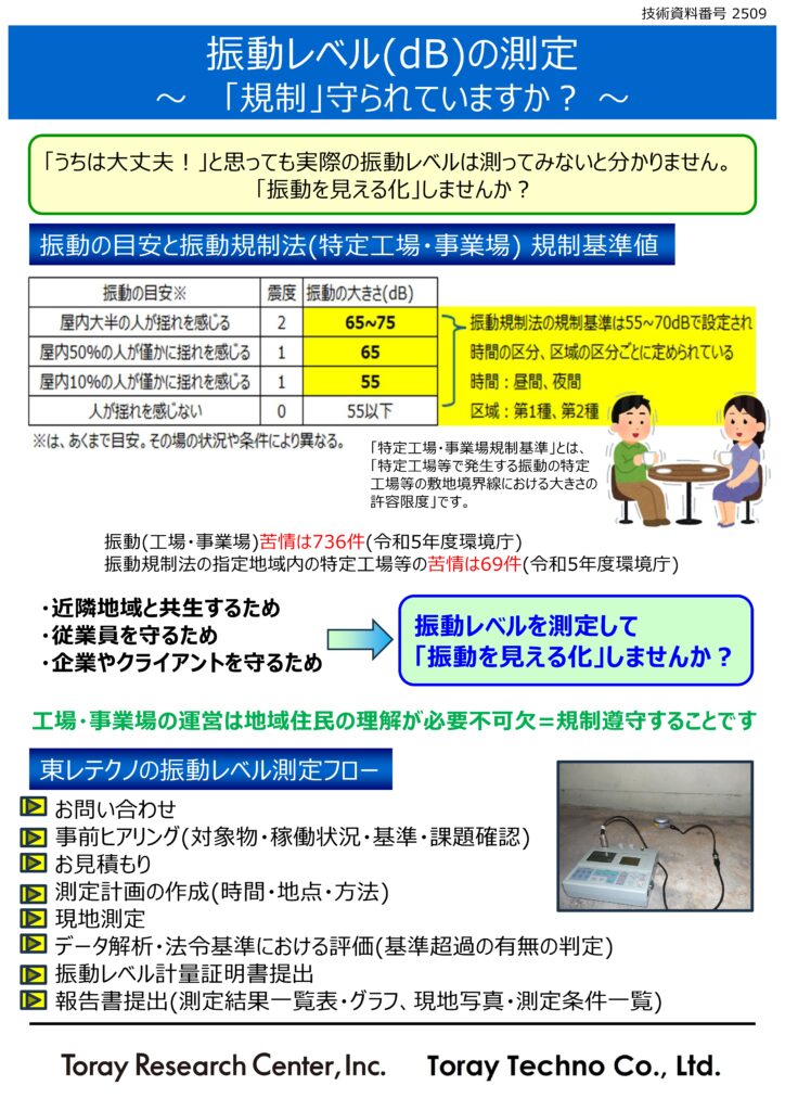 振動レベル(dB)の測定 ~「規制」守られていますか?~ 工場・事業場と近隣地域との良好な関係を築き、共生していくためには振動レベルの規制遵守が必要不可欠です。当社では振動レベルの測定を実施しております。 戻る
