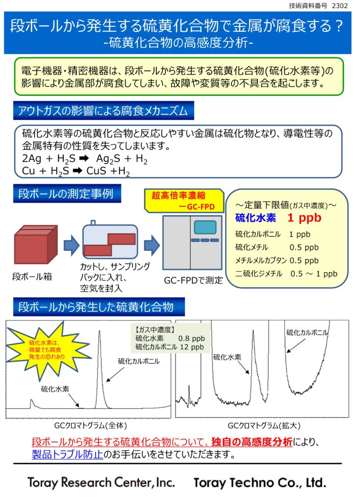 製品の破損防止を目的とする梱包材が、製品を腐食する可能性があることをご存じでしょうか。梱包材から発生する硫黄化合物は電子機器・精密機器を腐食し品質低下を招きます。東レテクノでは、硫黄化合物等を独自の高感度分析手法を用いて定量し、製品トラブル防止のお手伝いを行います。お気軽にお問合せください。
