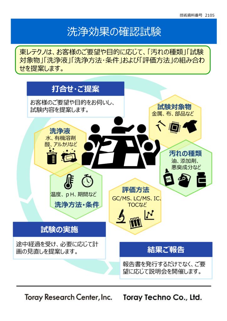 東レテクノでは、お客様のご要望に応じた様々な洗浄効果の確認試験に対応します。汚れの種類、金属・部品などの試験対象物に応じて、水・有機溶剤などの洗浄液、温度・pHなどの試験条件および各種評価方法の組み合わせについて、お客様との打ち合わせによって試験内容を提案します。