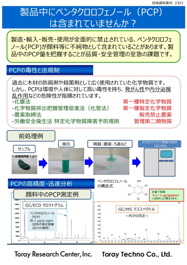 ペンタクロロフェノールは、有害な化学物質であり、顔料等の製品中に混入していると人体や環境に悪影響を及ぼす可能性があります。加えて、化審法第一種特定化学物質にも指定されており、製品中への含有は禁止されています。弊社では、高精度かつ迅速なペンタクロロフェノールの分析サービスをご提供しております。是非ご利用ください。