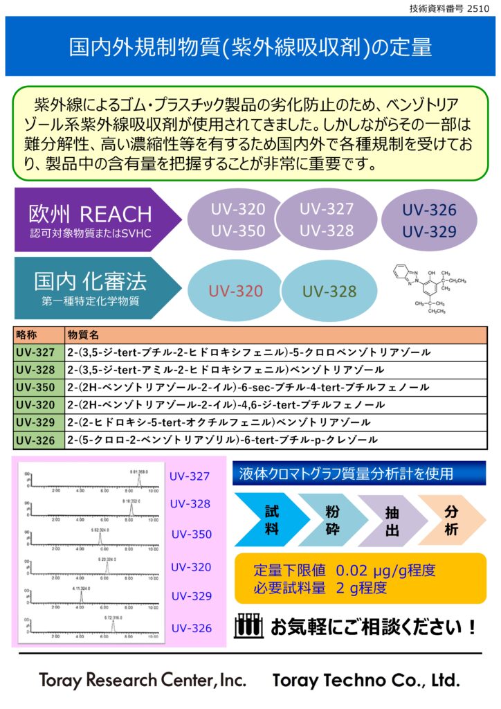 紫外線によるゴム・プラスチック製品の劣化防止のため、ベンゾトリアゾール系紫外線吸収剤が使用されてきました。しかしながらその一部は難分解性、高い濃縮性等を有するため国内外で各種規制を受けており、製品中の含有量を把握することが非常に重要です。