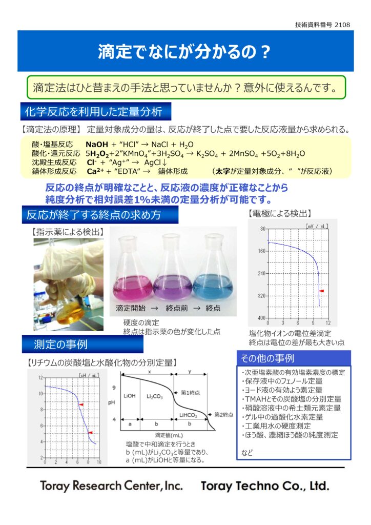 滴定法の強みは定量値の正確さです。また、飲料水の硬度測定、除菌液・滅菌液の次亜塩素酸濃度測定から、リチウムイオンバッテリーの主成分であるリチウム塩の定量まで、幅広く利用できる手法です。先端技術の発展に役立つ滴定分析を、東レテクノの経験豊かなメンバーがご提案いたします。