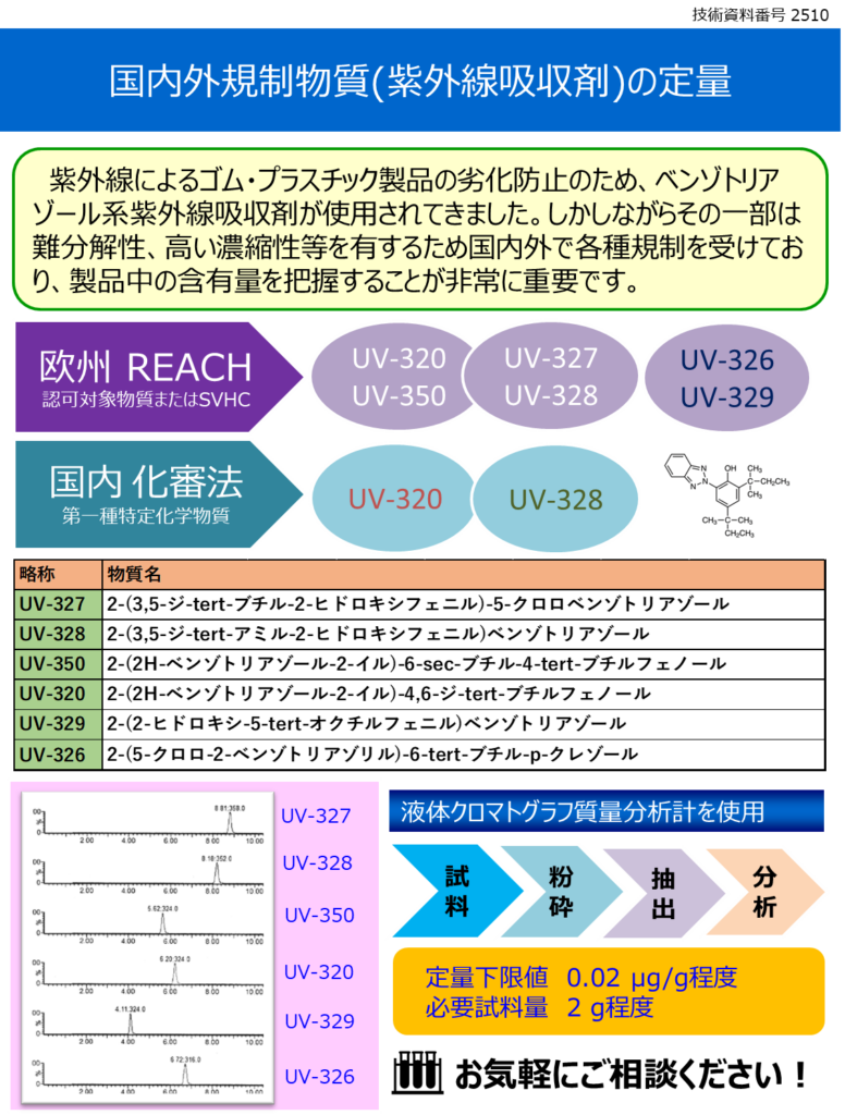 紫外線によるゴム・プラスチック製品の劣化防止のため、ベンゾトリアゾール系紫外線吸収剤が使用されてきました。しかしながらその一部は難分解性、高い濃縮性等を有するため国内外で各種規制を受けており、製品中の含有量を把握することが非常に重要です。